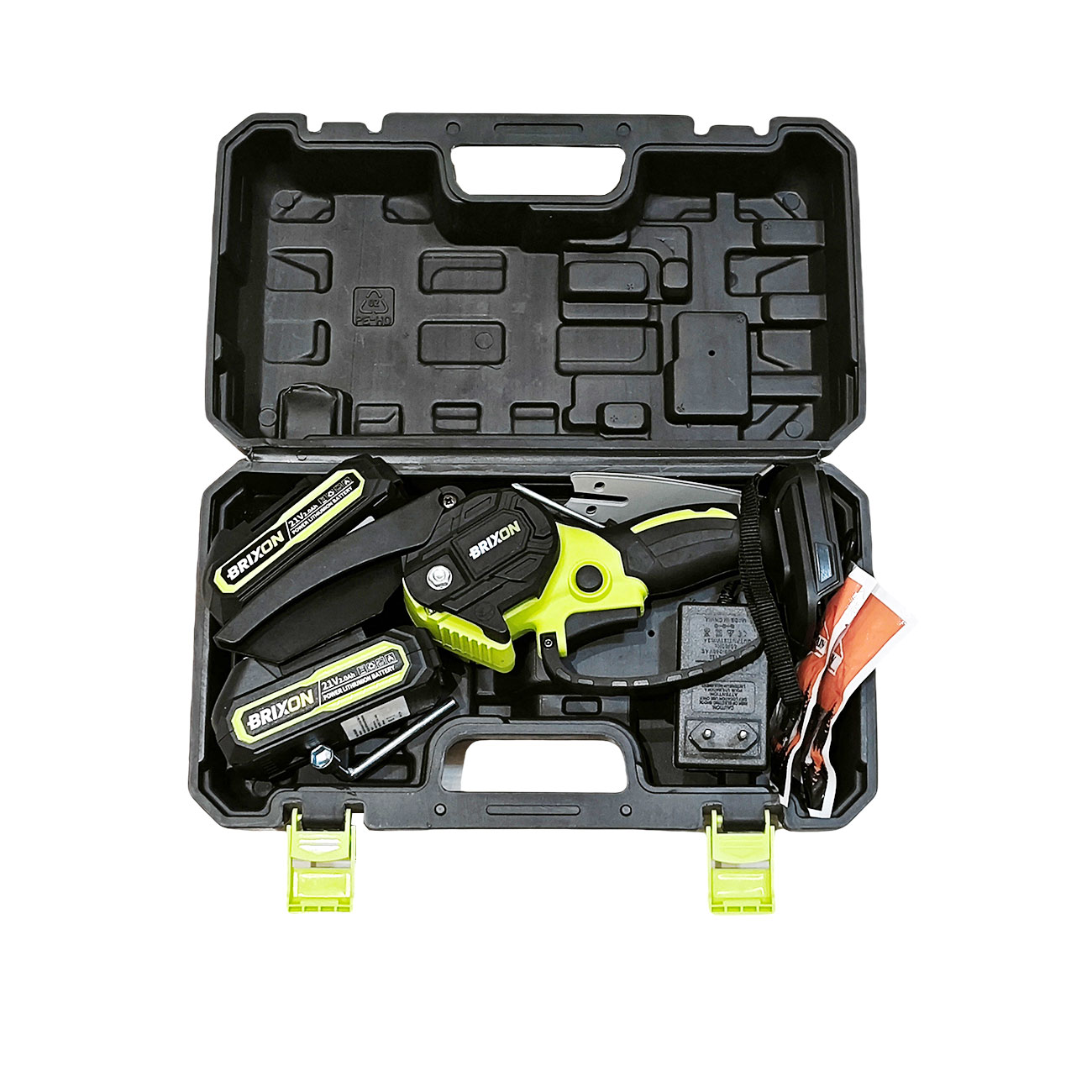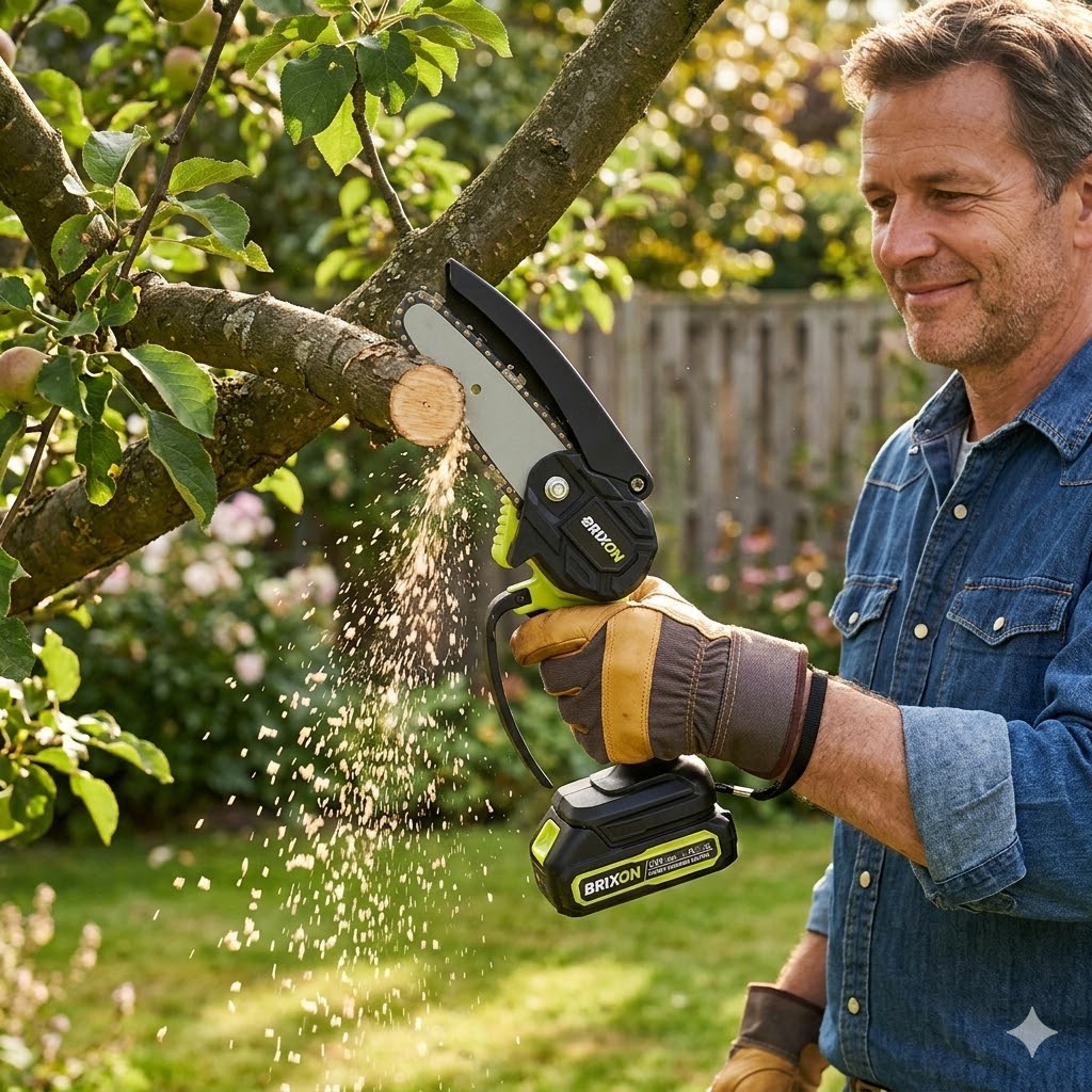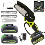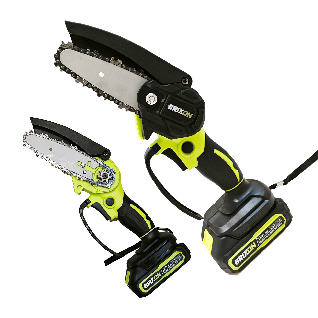 Mini pilarka elektryczna nadaje się do pracy w ogrodzie, cięcia drewna i gałęzi.