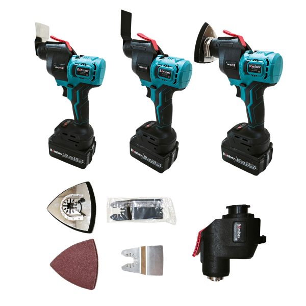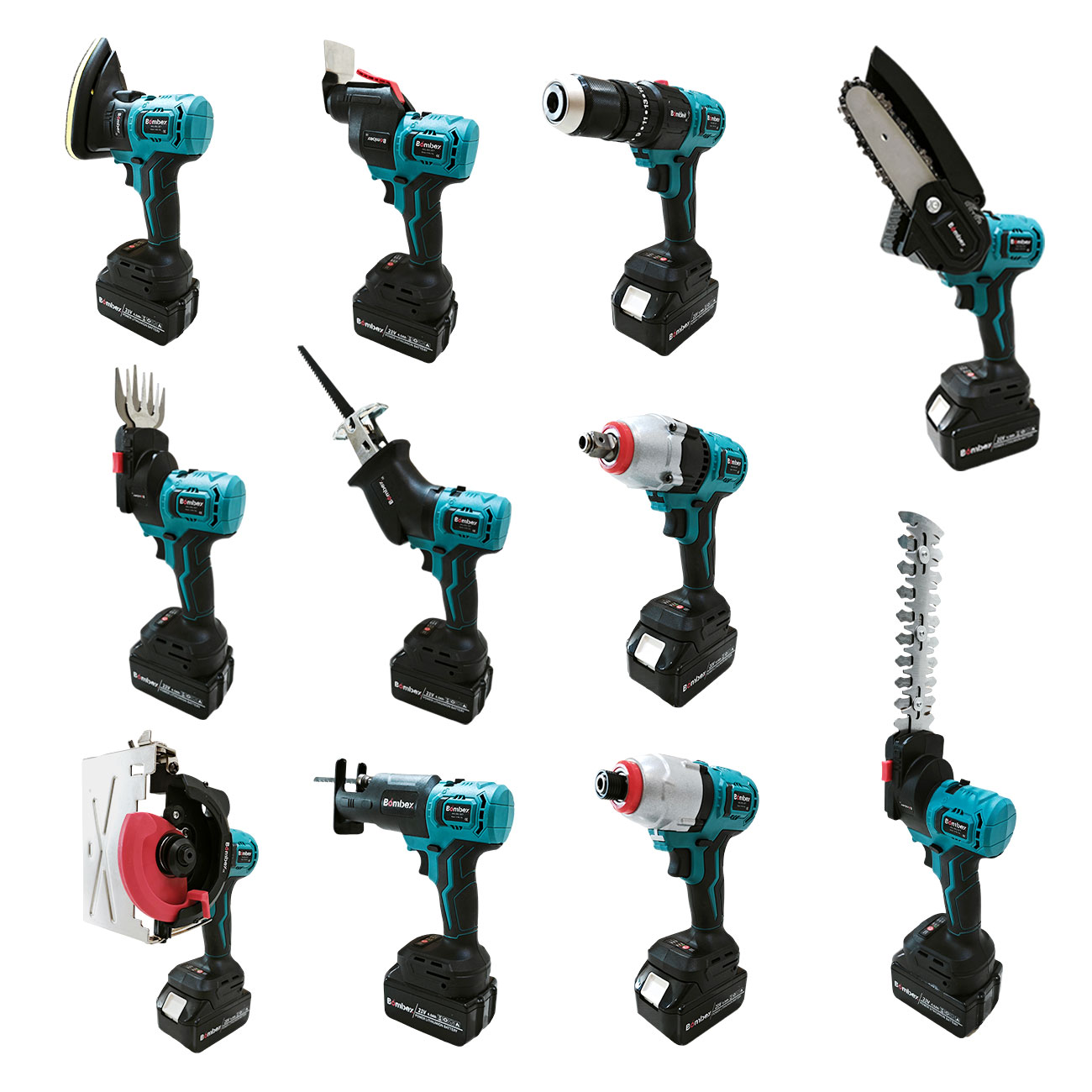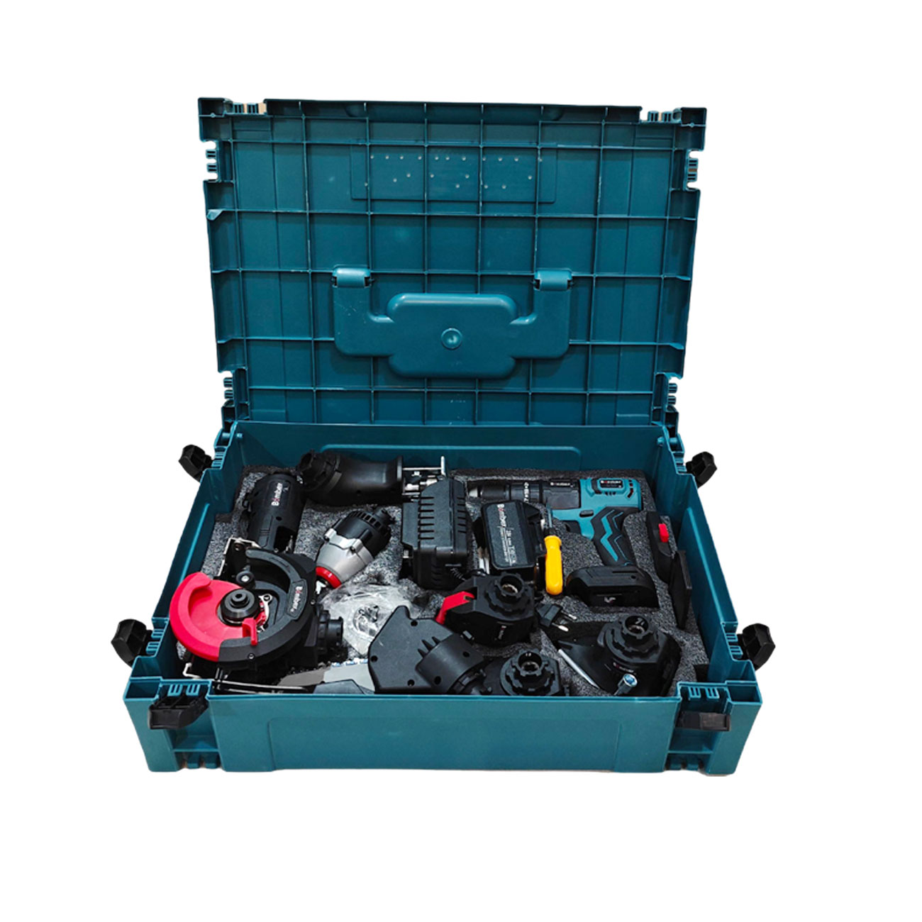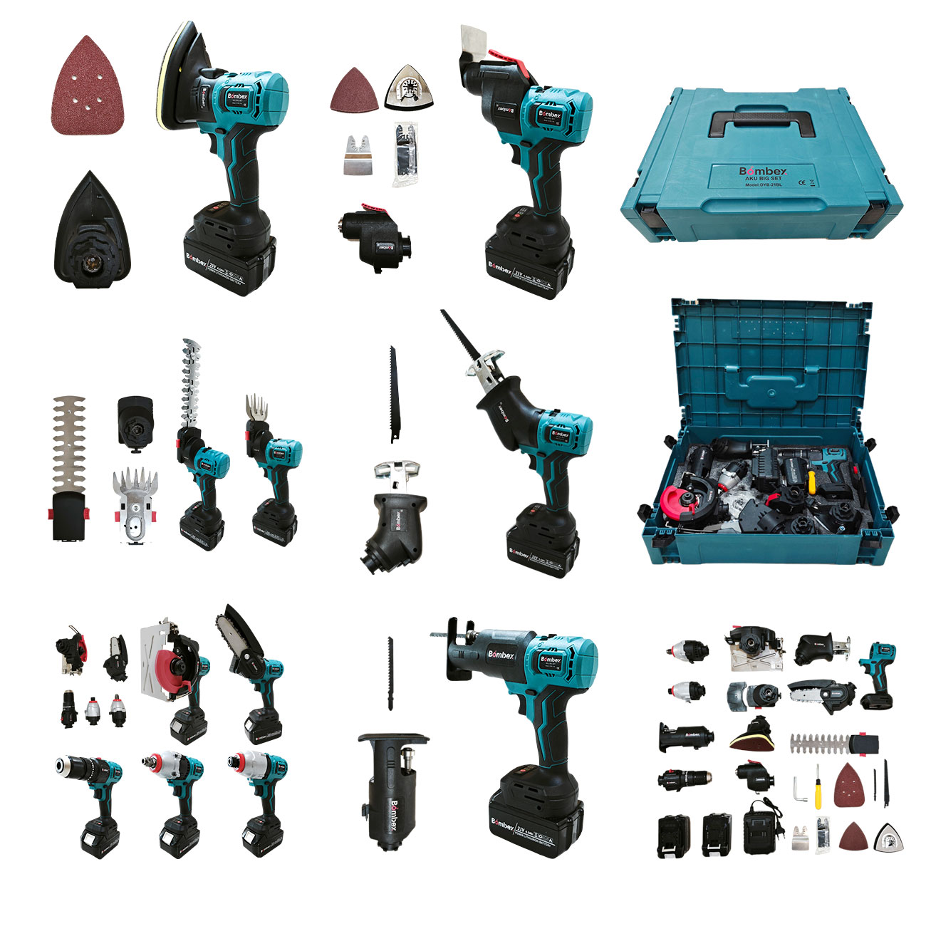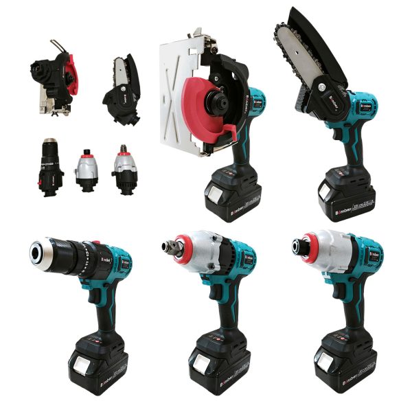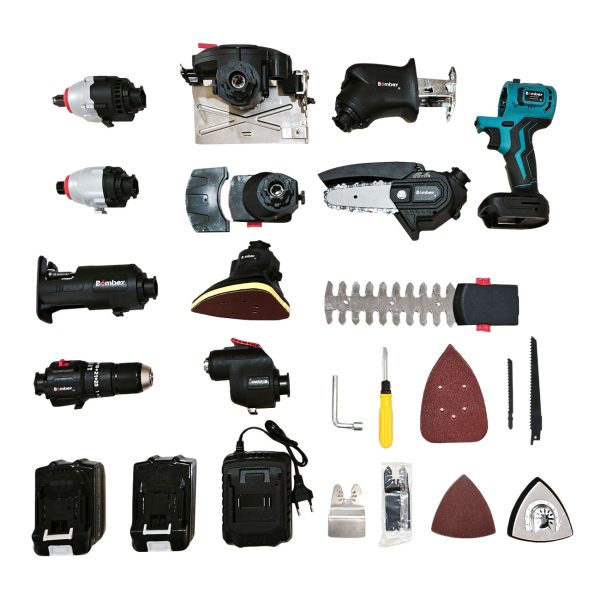 Zestaw zawiera wszystko, czego potrzebujesz: wiertarkę, piłę do liści, piłę łańcuchową, dokrętarkę, śrubokręt, nożyce do żywopłotu, nożyce do trawy, piłę prostą, szlifierkę oscylacyjną, piłę tarczową i przystawkę wielofunkcyjną.